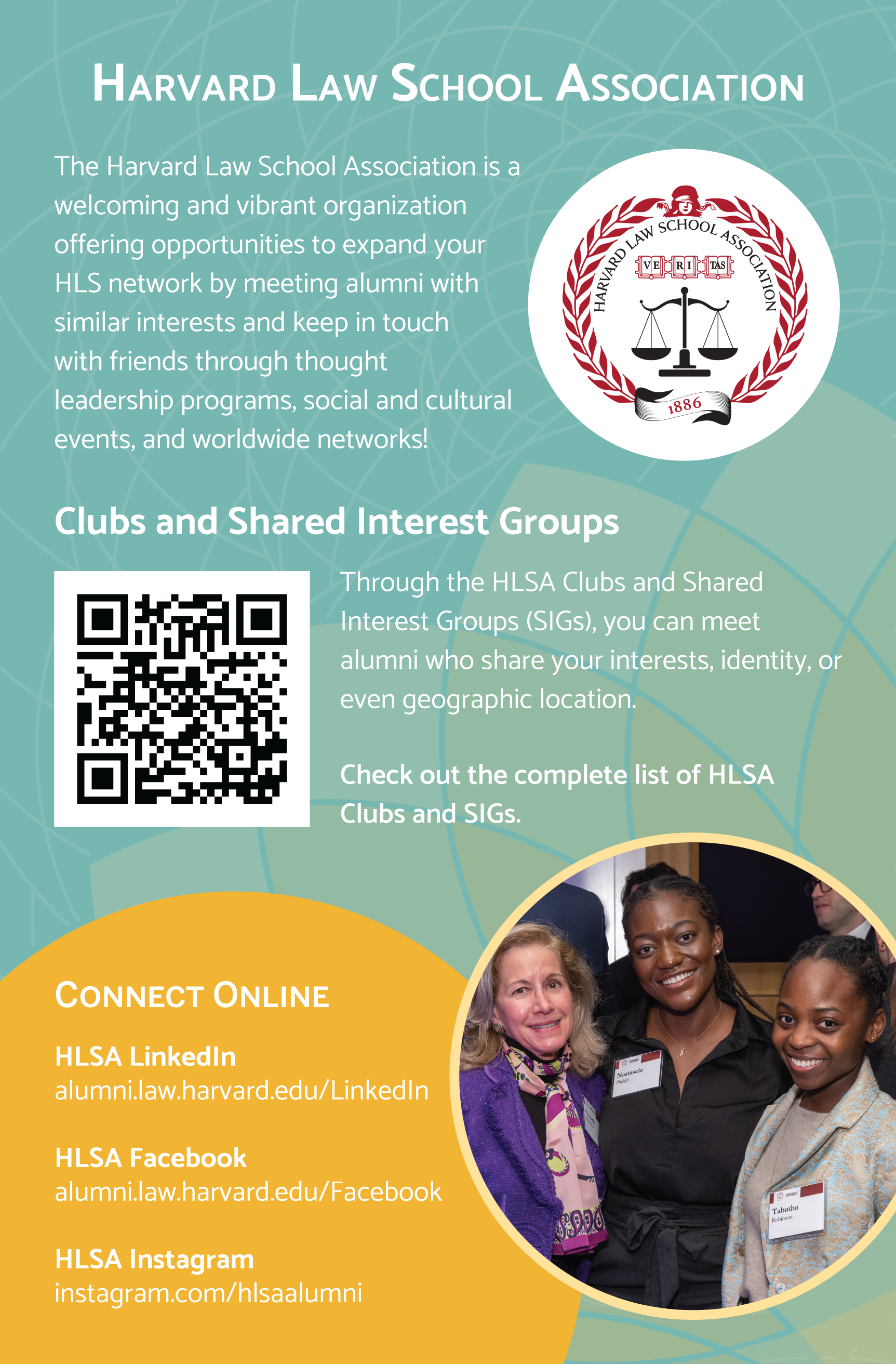 - The HLS Alumni Center offers alumni volunteer opportunities beyond the HLSA and its Clubs/SIGs. These include participation in Class Reunion and Affinity Celebration committees and giving programs to encourage peers to give to HLS. Contact alumnirelations@law.harvard.edu for additional information.