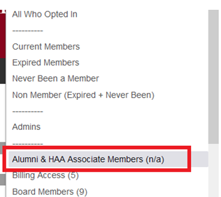 If you are looking to send a newsletter to only individuals who are alumni, select Alumni & HAA Associate Members (reference in the image below).